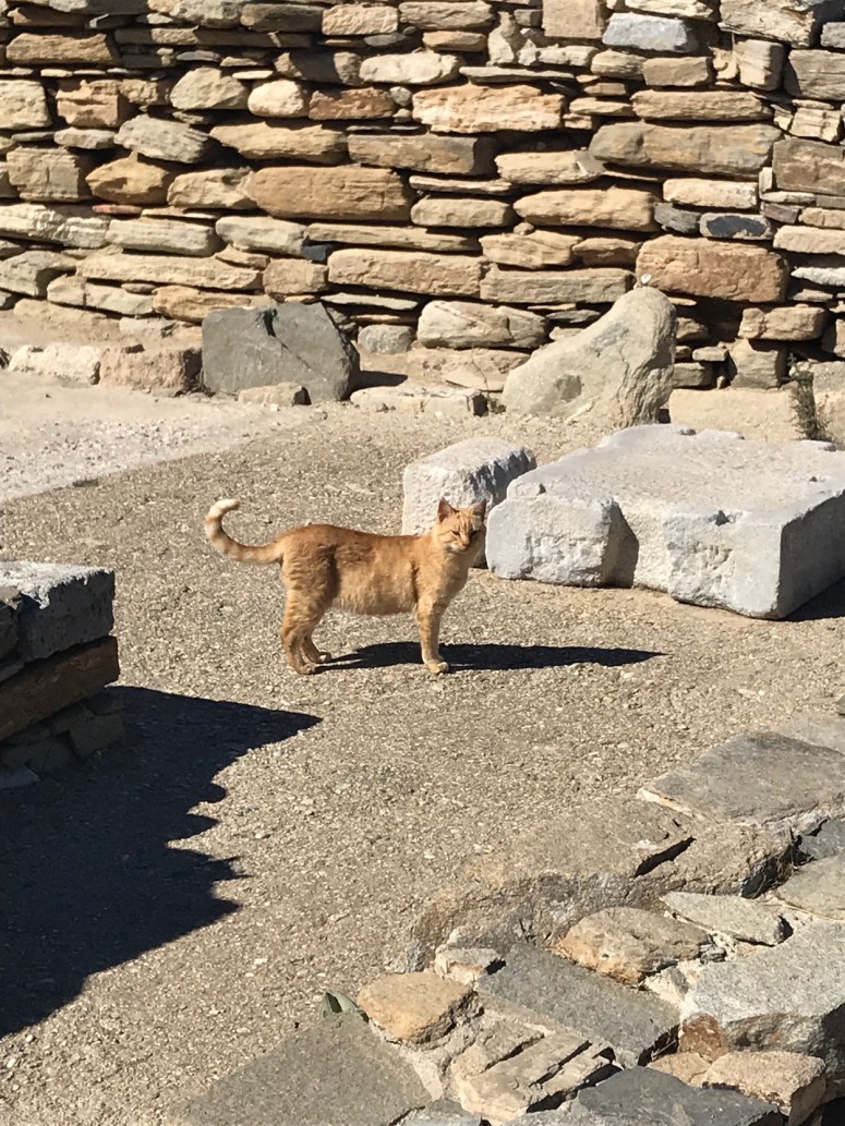 We took a sunset cruise on Stacey’s birthday, which took us all around the caldera and the adjacent waters of the Aegean Sea. I couldn’t pass up the opportunity for a quick swim. But it was indeed quick, because the water was too cool to stay in for too long. We went to a tasting at one of the wineries on Santorini. The wines were fantastic, and they were paired with some incredible dishes. My travel companions have some better shots of our meal at the winery—all I have is a few pictures of the little beggar kittens who kept asking for their own tasting, especially of the seafood dishes.